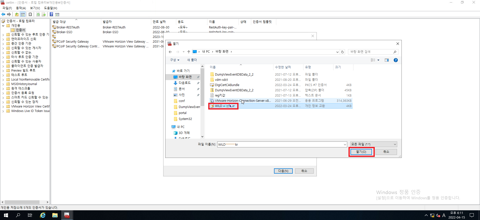 13. 인증서를 선택하시고 열기 버튼을 눌러주세요.
