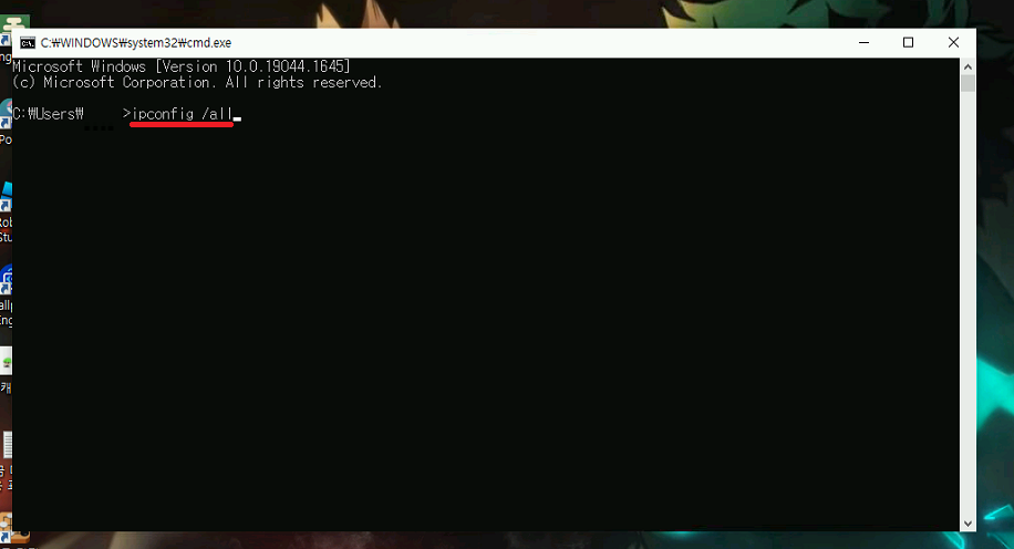 3. 커맨드창이 뜨셨다면 ipconfig /all 을 입력해서 현재 나의 컴퓨터 아이피를 확인해줍시다.