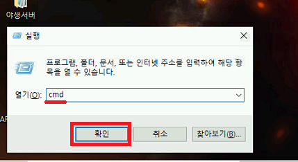 2. 실행창이 뜨셨으면 cmd를 입력하고 확인을 눌러줍시다.