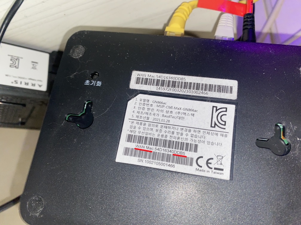 8. 비밀번호를 확인하기 위해 GN866ac 공유기의 밑면을 확인해서 WAN Mac이라는 부분을 확인해줍시다.