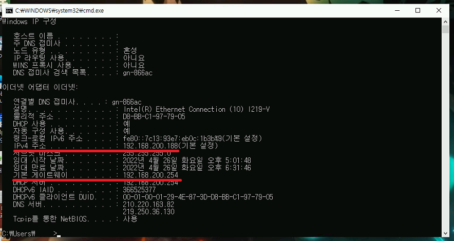 5. 우리가 필요한건 이 컴퓨터의 IPv4 주소와 기본 게이트웨이 주소입니다.