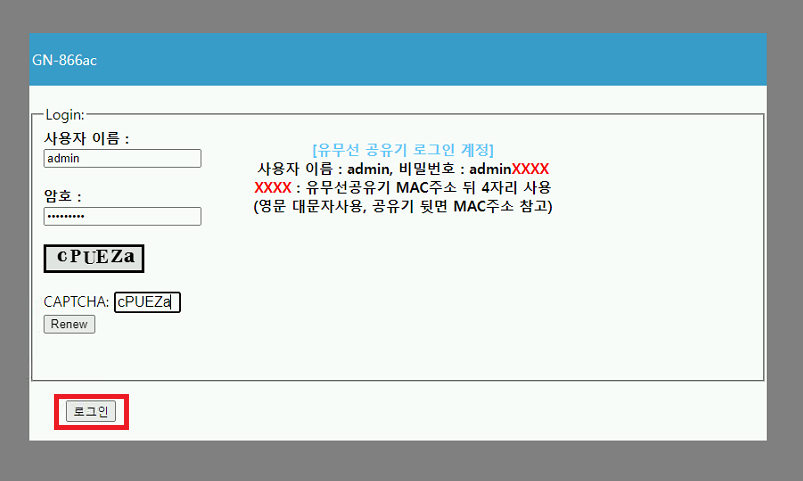 XXXX 는 유무선공유기 MAC주소의 뒤 4자리를 입력하시면됩니다.