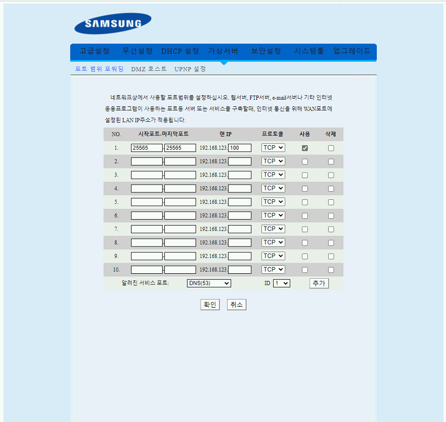 SAMSUNG SWW-N1100 유무선공유기 포트포워딩 하는 법