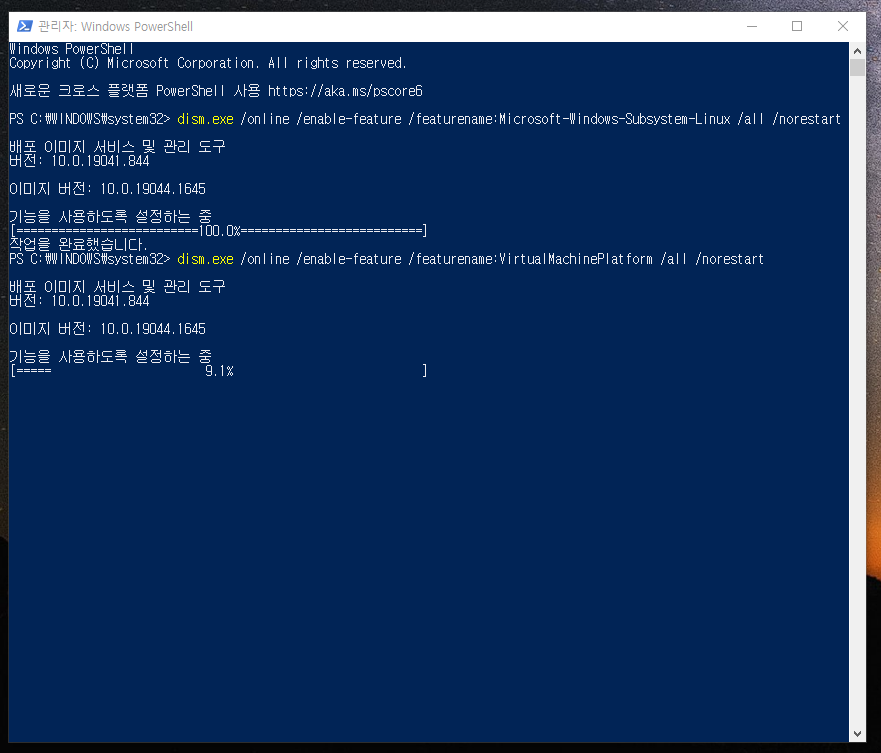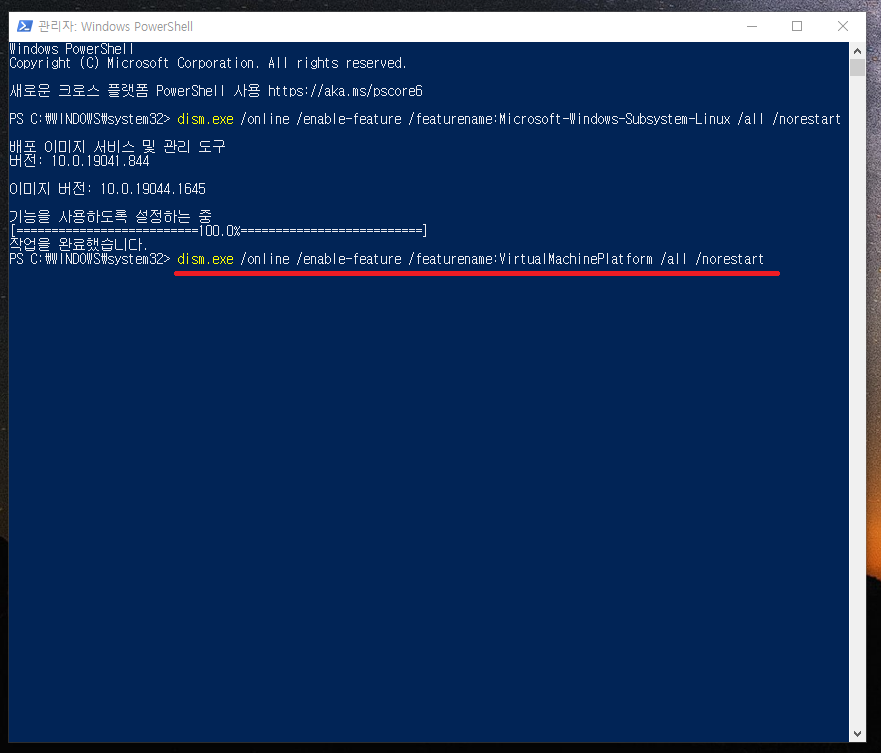 12. 명령어 입력 후 엔터키를 치시면 위와 같이 가상머신플랫폼의 기능을 활성화 시켜줍니다.