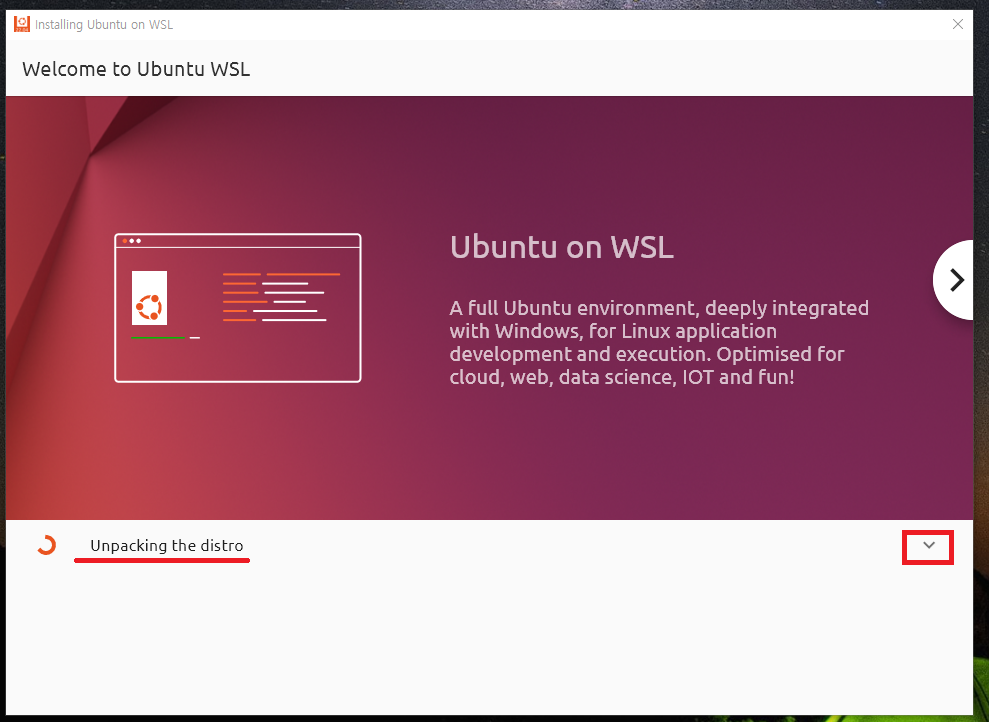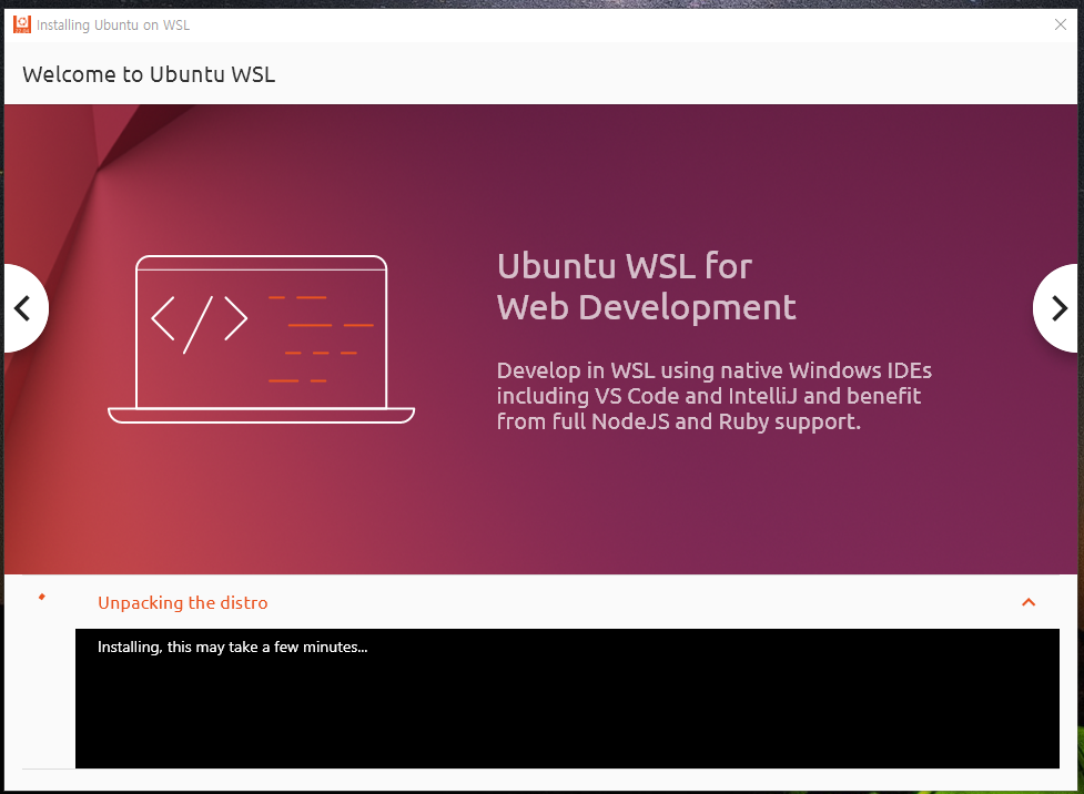 31. 최초 실행 시 Ubuntu on WSL 설치 프로그램이 실행됩니다.