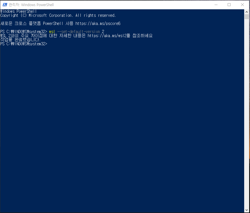 15. 작업을 완료했습니다 메시지가 뜨면 wsl 구성 시 기본값이 wsl2 버전으로 구성됩니다.