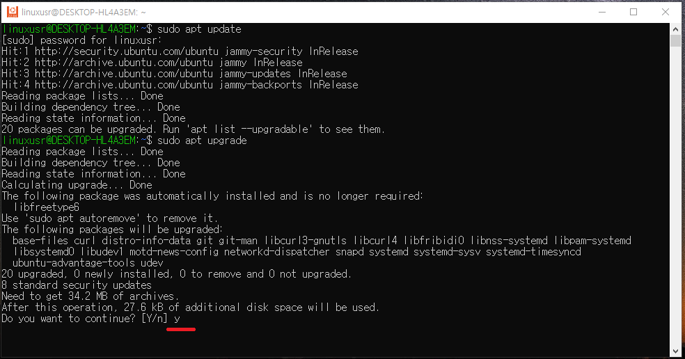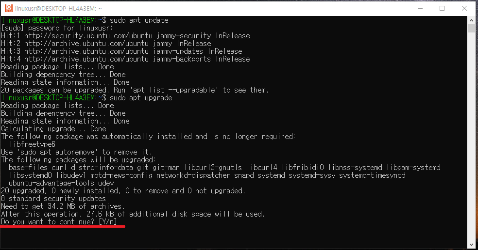 명령어를 입력하여 업그레이드를 진행합시다.