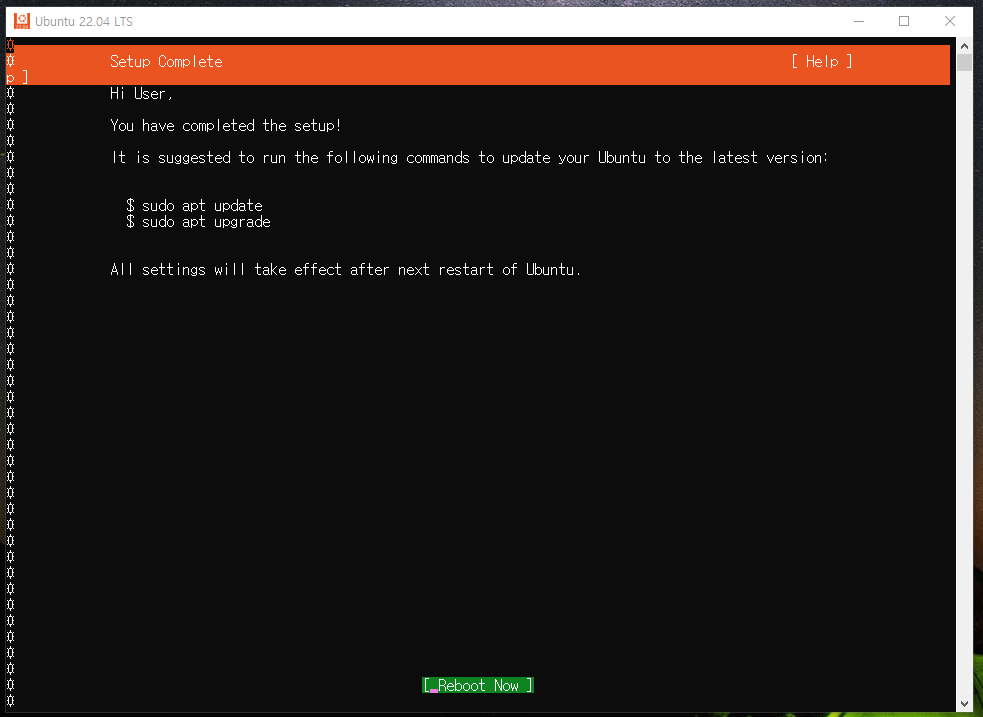 Reboot Now에서 엔터키를 눌러 WSL 리눅스를 재부팅해줍시다. ( 윈도우는 재부팅 안되니 걱정안하셔도 됩니다.)
