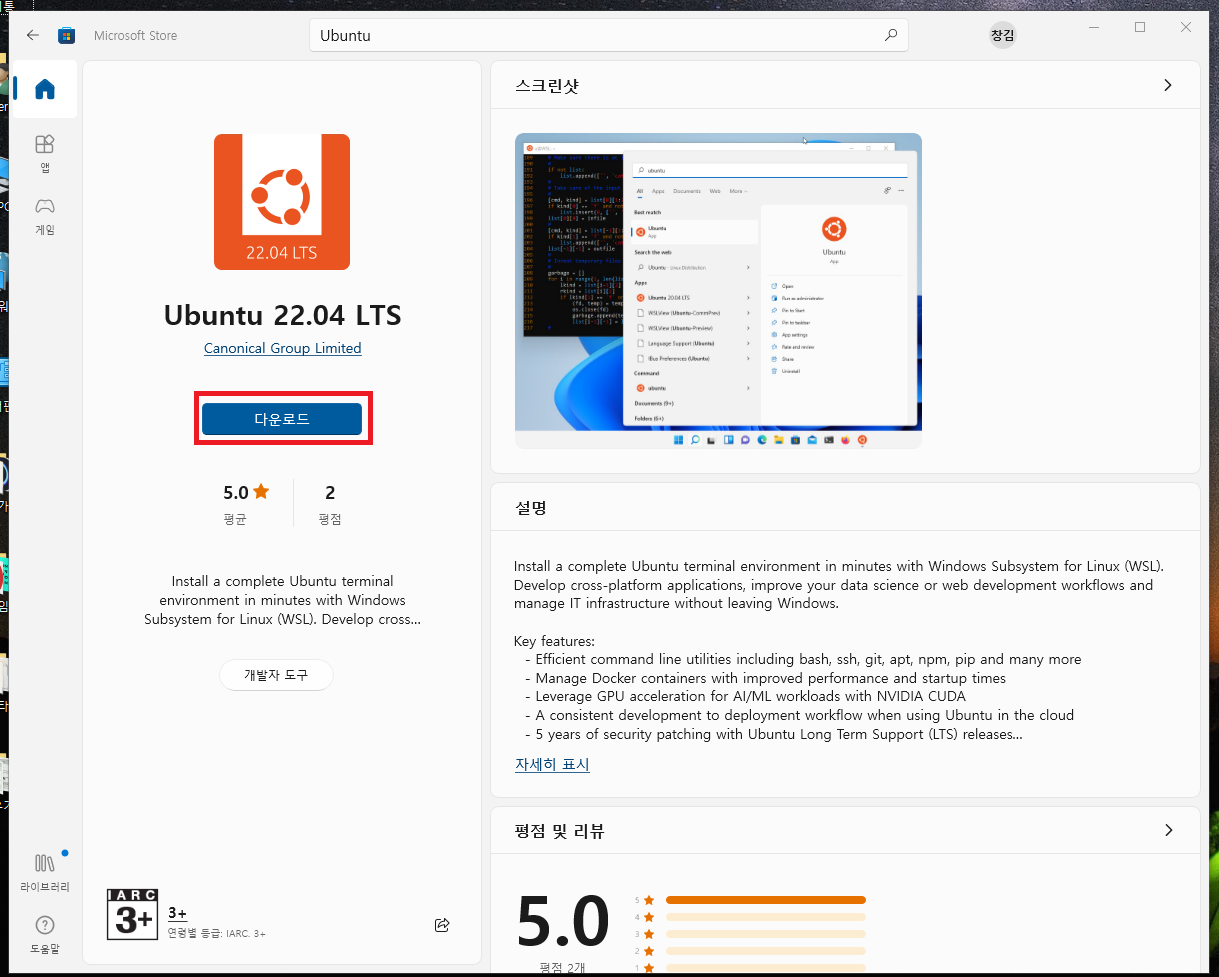 로 접속하시면 마이크로소프트 WSL 리눅스 배포판을 확인하실 수 있습니다.