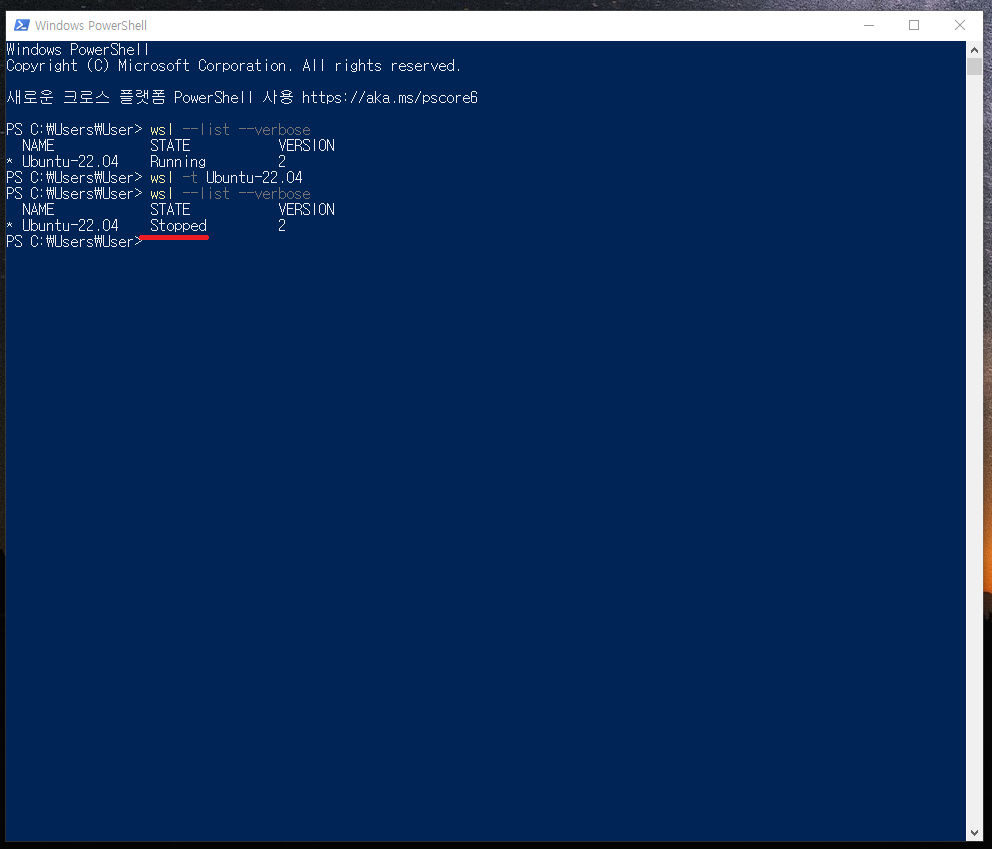 STATE가 Running에서 Stopped으로 변경되었다면 정상적으로 WSL 가상머신이 꺼진겁니다.