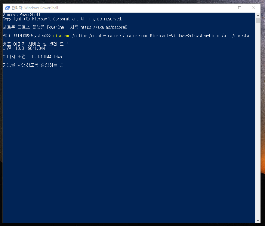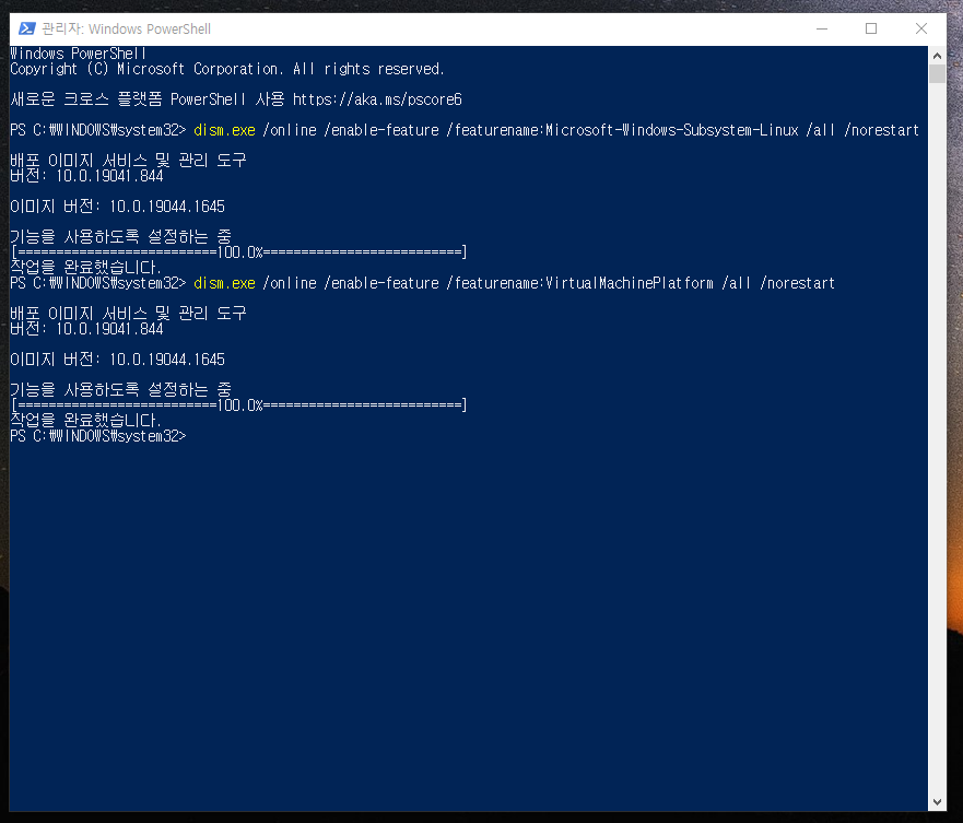 12. 명령어 입력 후 엔터키를 치시면 위와 같이 가상머신플랫폼의 기능을 활성화 시켜줍니다.