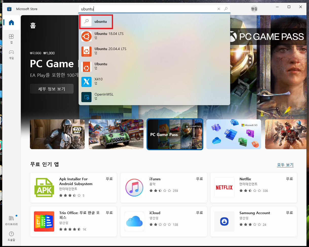 25. 마소 스토어가 켜지면 위 검색창에 ubuntu를 입력해줍시다.