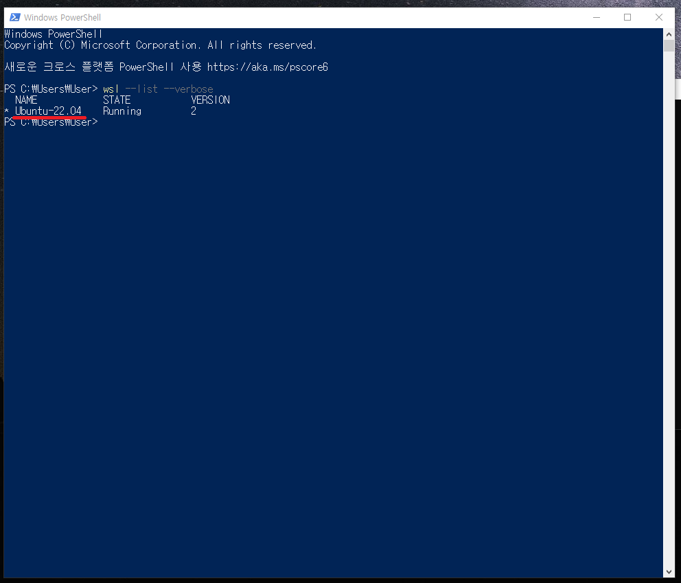 wsl --list --verbose 명령어를 입력해서 확인해줍시다.