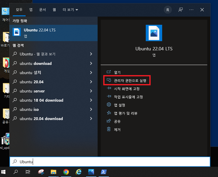 Ubuntu 를 검색하여 관리자 권한으로 실행해줍시다.(그냥 열기하셔도 되긴합니다)