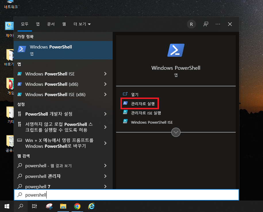 5. 검색창에서 powershell을 검색해줍시다.