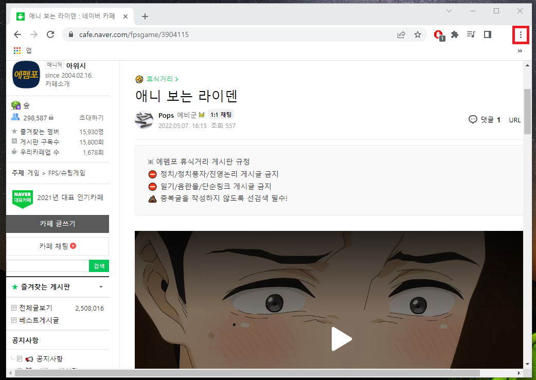 혹시나 네이버 카페가 새로고침 시 가장 처음 접속한 곳으로 가질 수도 있으니 다시 영상이 있는 게시글로 와줍시다.