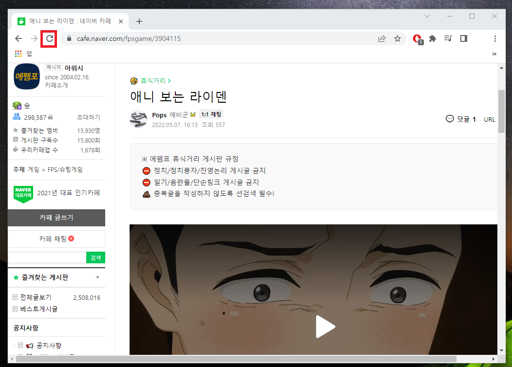 혹시나 네이버 카페가 새로고침 시 가장 처음 접속한 곳으로 가질 수도 있으니 다시 영상이 있는 게시글로 와줍시다.