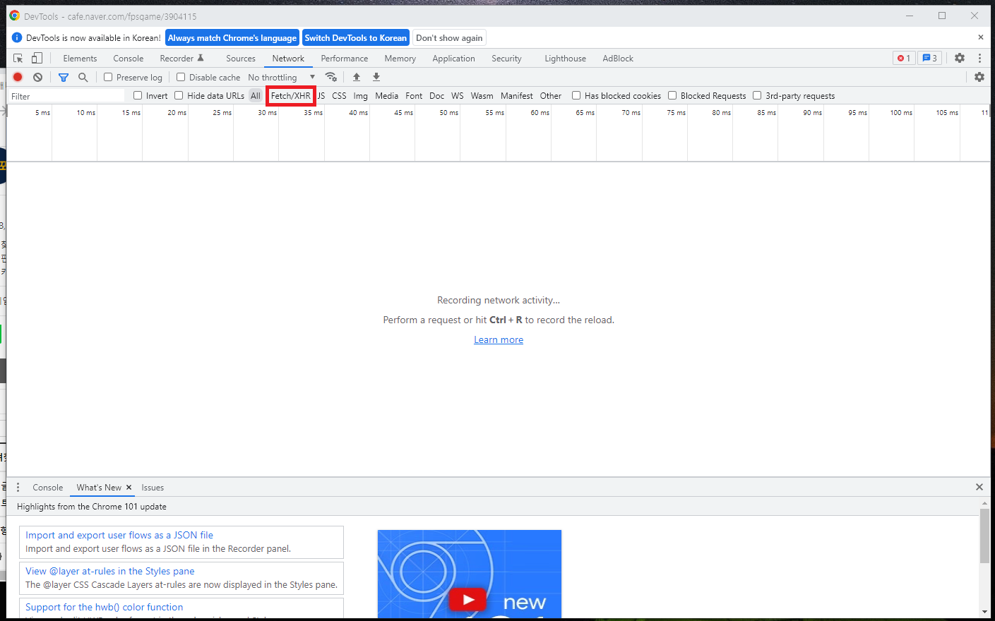 6. Fetch/XHR로 선택하셨다면 개발자도구창을 닫지 마시고 옆으로 밀어둡시다.