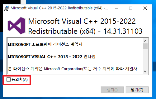 6. 위와 같이 설치 프로그램이 시작되면 동의함에 체크해줍시다.