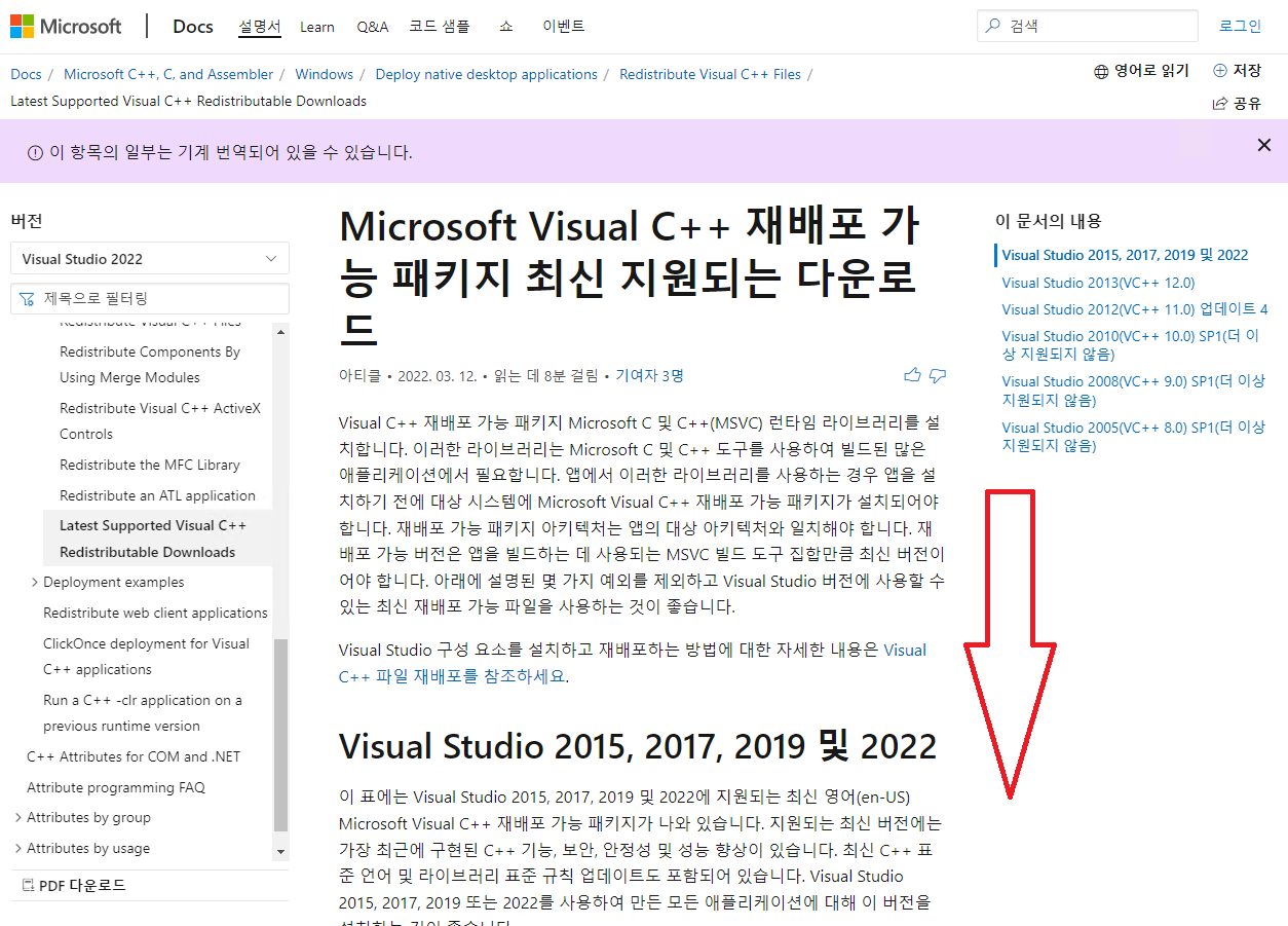 3. Visual Studio 2015, 2017, 2019 및 2022 라고 써져있는 곳 까지 내려줍니다.