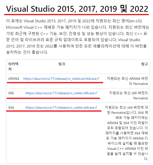 https://docs.microsoft.com/ko-kr/cpp/windows/latest-supported-vc-redist?view=msvc-170