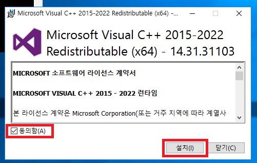 6. 위와 같이 설치 프로그램이 시작되면 동의함에 체크해줍시다.