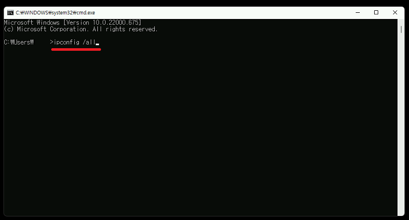 3. 커맨드창이 뜨시면 명령어 ipconfig /all 을 입력해줍시다.