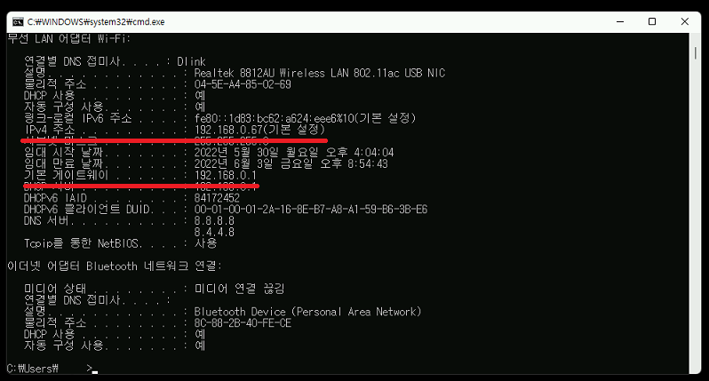유선이라면 이더넷 어댑터 쪽에 아이피 정보가 있을 겁니다.