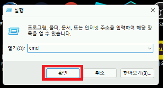 2. 실행창에 cmd 를 입력하고 확인 버튼을 눌러줍시다.