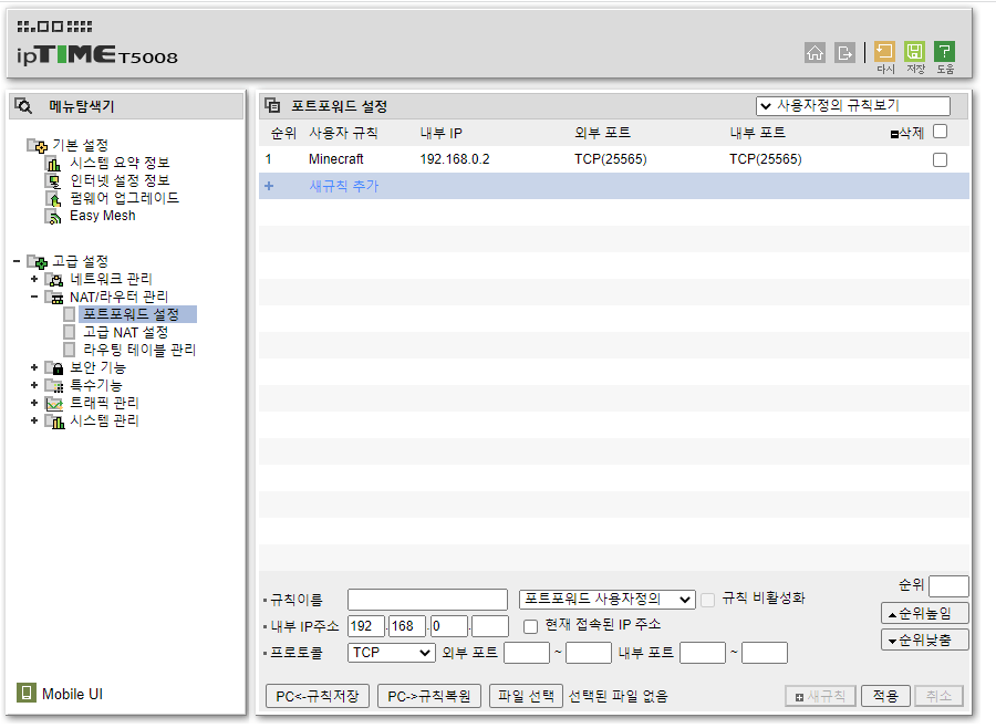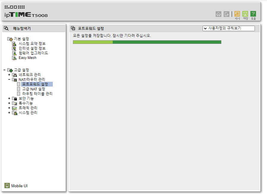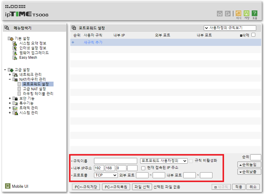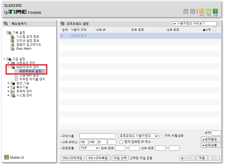 아이피타임 T5008 유선 공유기 포트포워딩 하는법