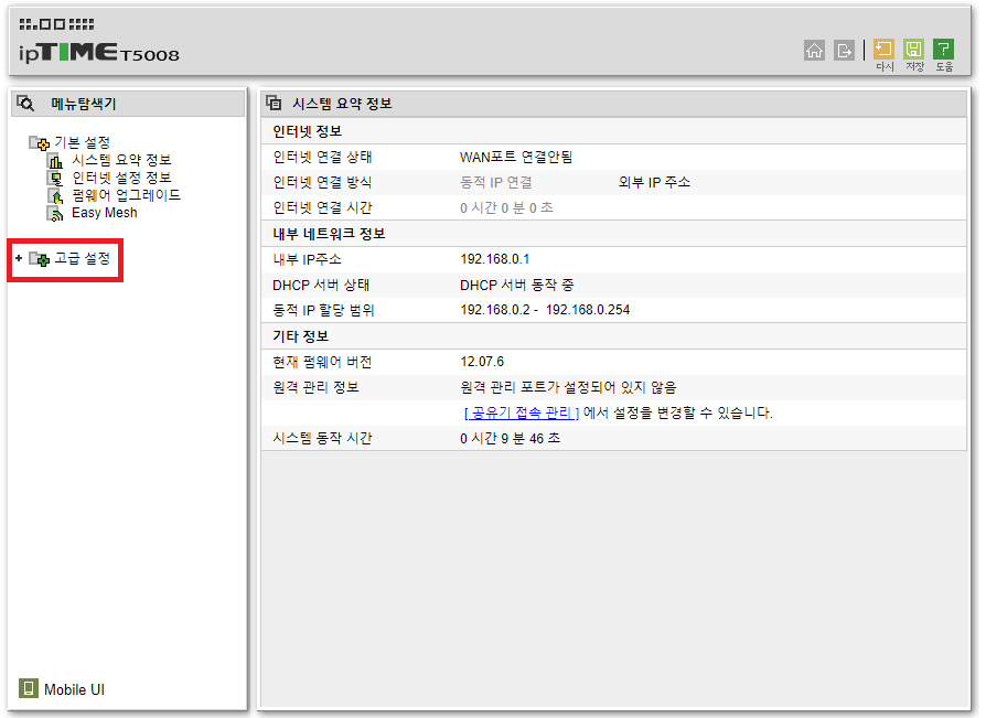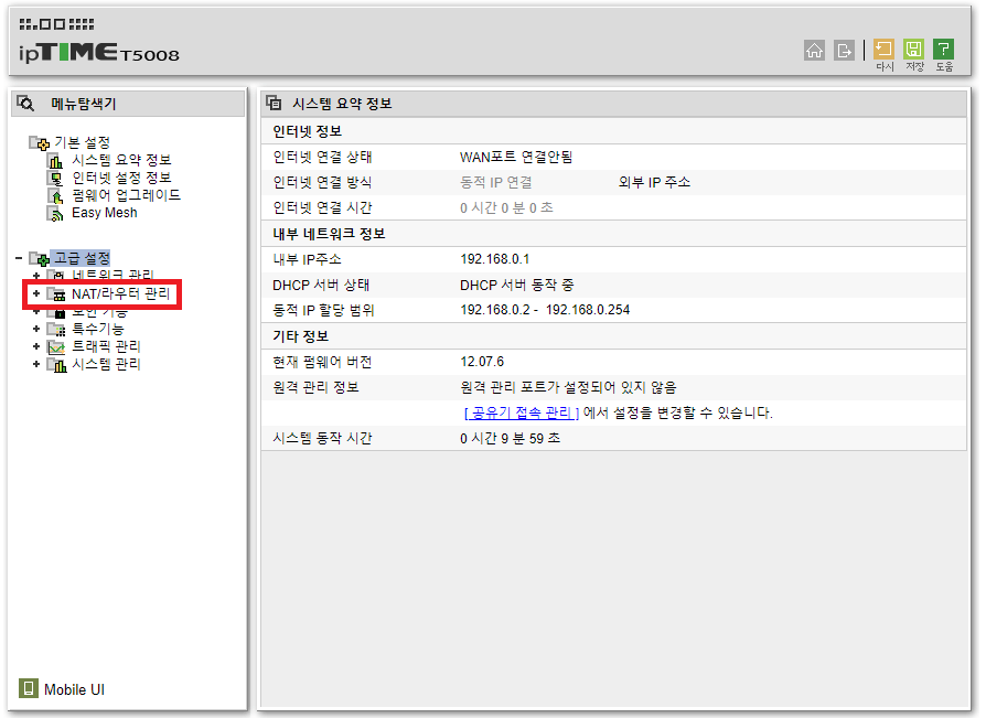 12. 고급 설정을 펼치면 NAT/라우터 관리 메뉴가 보이실 겁니다.