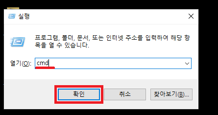 2. 실행창이 뜨면 cmd를 입력하고 확인을 눌러줍시다.