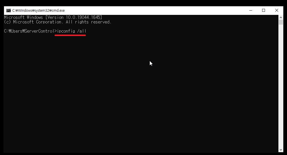 4. ipconfig /all 명령어를 입력하고 엔터 키를 쳐서 명령을 실행해줍시다.