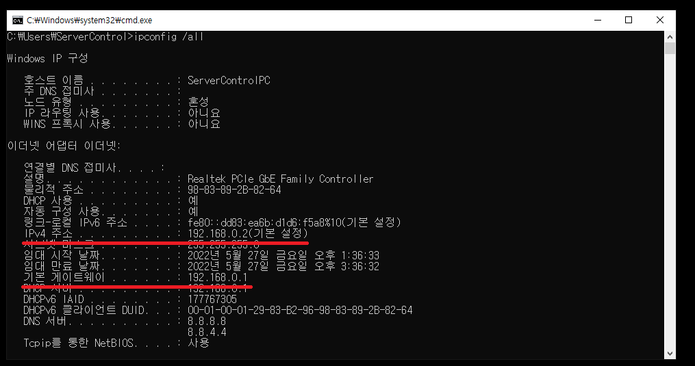 내부 IP주소에는 아까 처음에 확인한 IPv4 주소를