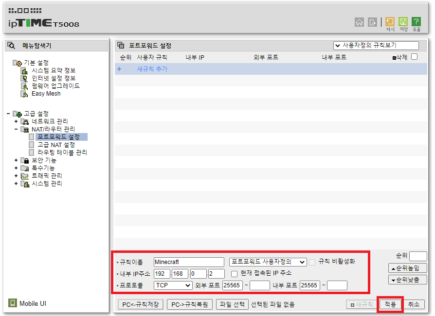 아이피타임 T5008 유선 공유기 포트포워딩 하는법