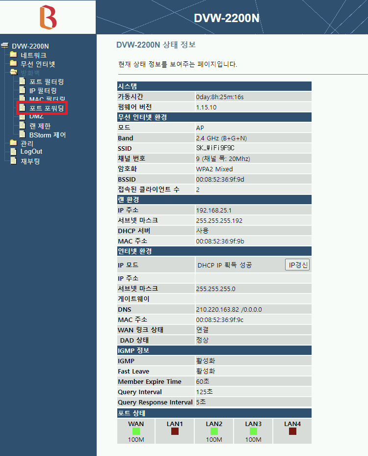 SKB 다보링크 DVW-2200N 유무선 공유기 포트포워딩 하는법