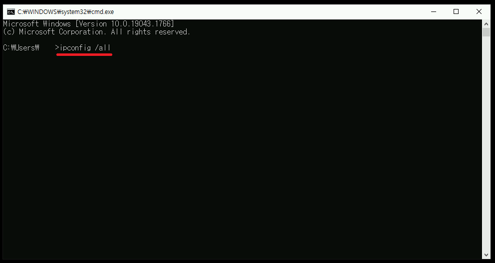 4. cmd 창이 뜨면 명령어 ipconfig /all 을 입력해줍니다.