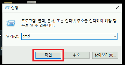 2. cmd 를 입력하고 확인을 눌러줍시다.