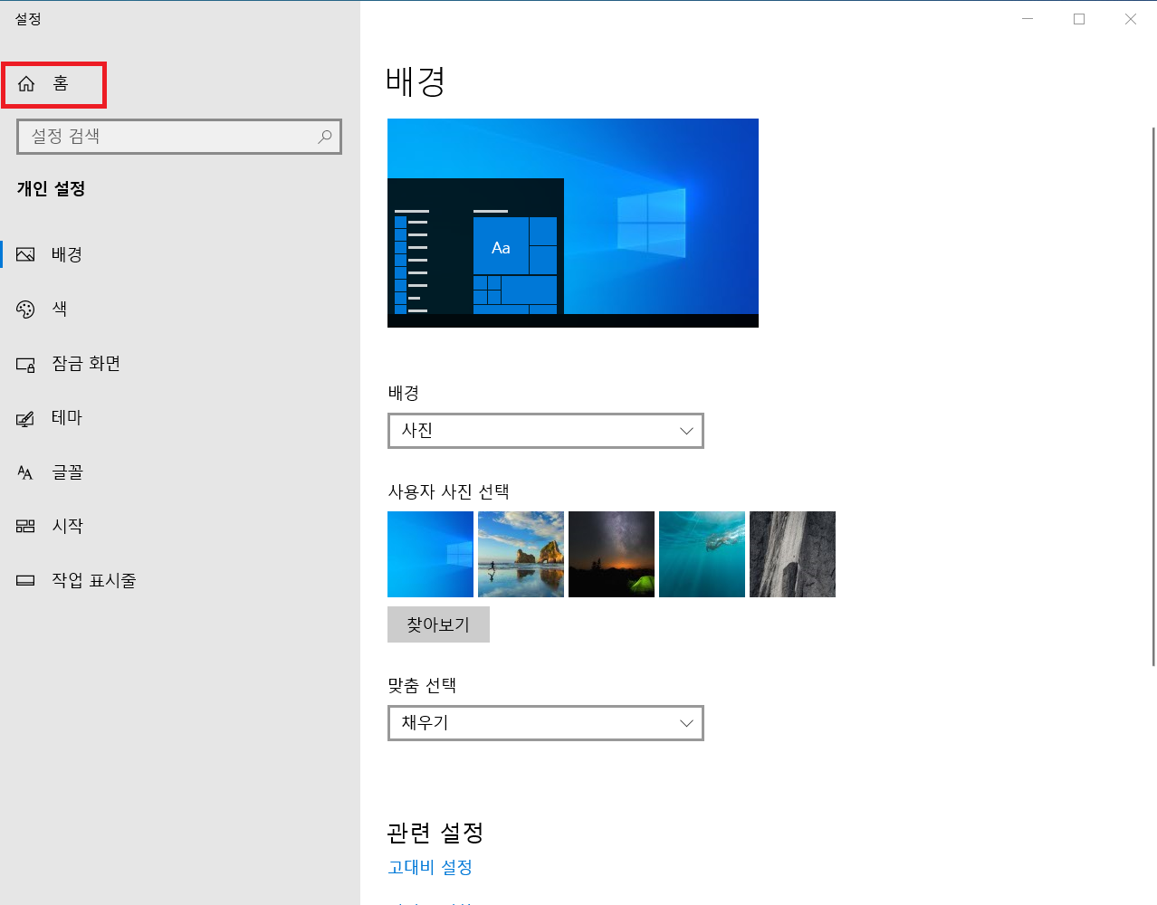 개인설정 메뉴를 클릭해줍시다.