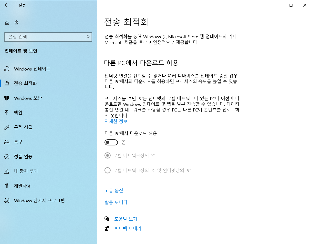 윈도우10 전송 최적화 설정 끄기