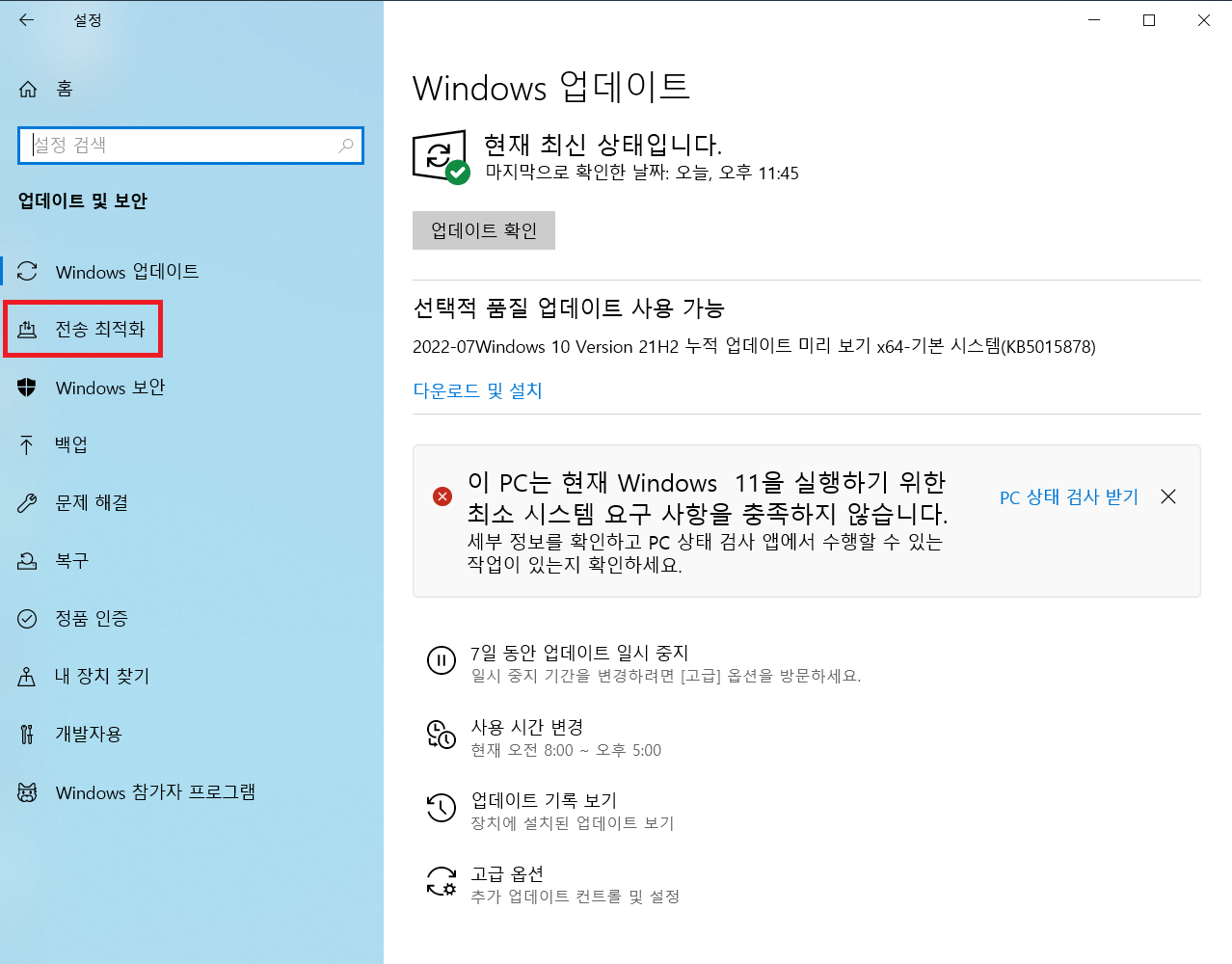 5. 업데이트 설정 메뉴로 들어오면 왼쪽 메뉴 탭에 전송 최적화라는 메뉴가 보이실겁니다.