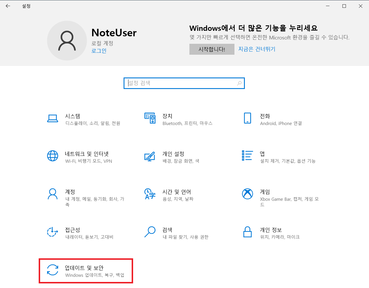 4. 설정 창의 홈으로 들어오면 업데이트 및 보안이라는 메뉴가 보이실 겁니다.