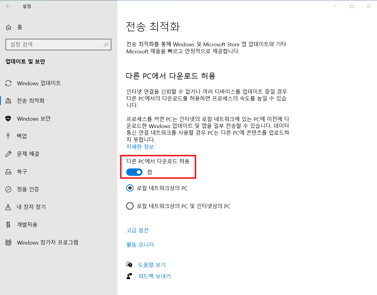 6. 전송 최적화 설정 메뉴로 들어오면 다른 PC에서 다운로드 허용 옵션이 보이실 겁니다.