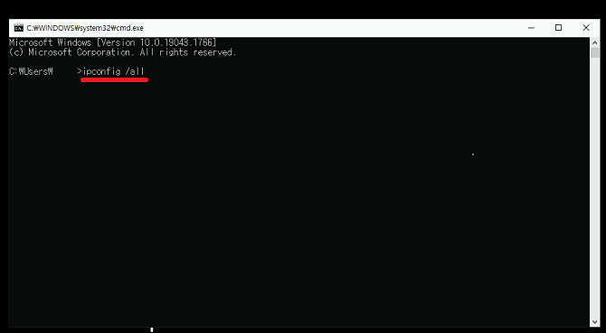 4. ipconfig /all 명령어를 입력하시고 엔터키를 눌러주세요.
