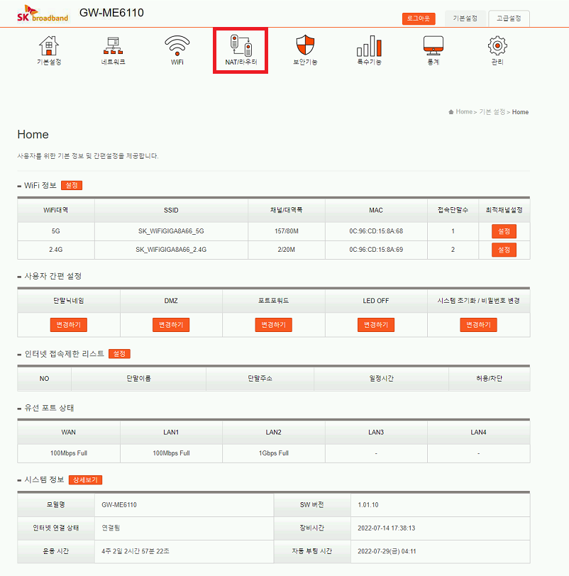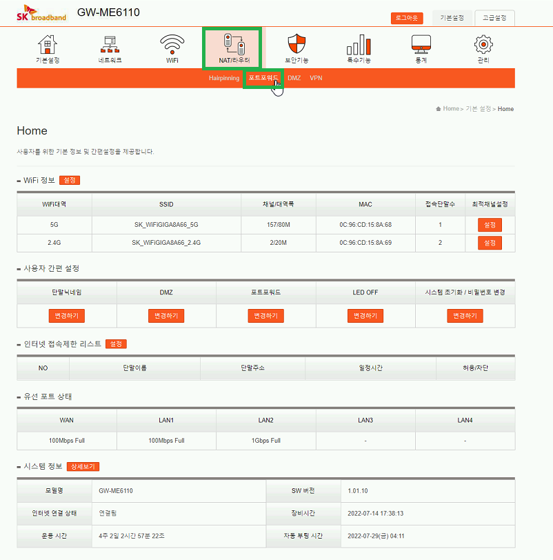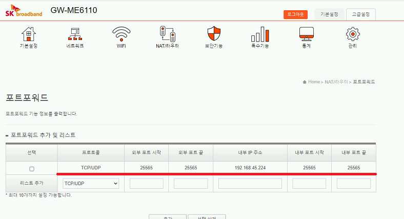 SKB 머큐리 GW-ME6110 유무선 공유기 포트포워딩 하는 법