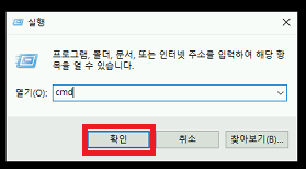 2. 실행창이 뜨면 cmd 를 입력하고 확인을 눌러줍시다.