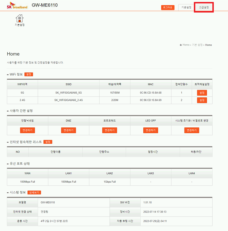 10. 공유기 설정 페이지로 들어와졌습니다.