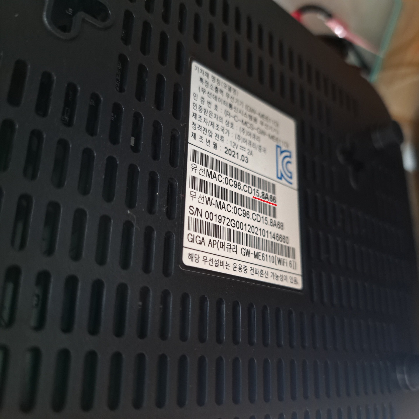 8. 공유기 밑면을 보시면 유선 MAC주소가 적혀있습니다.