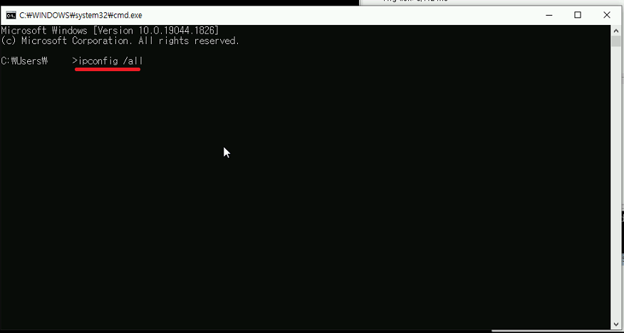 3. cmd 창이 뜨셨다면 ipconfig /all 명령어를 입력해줍시다.