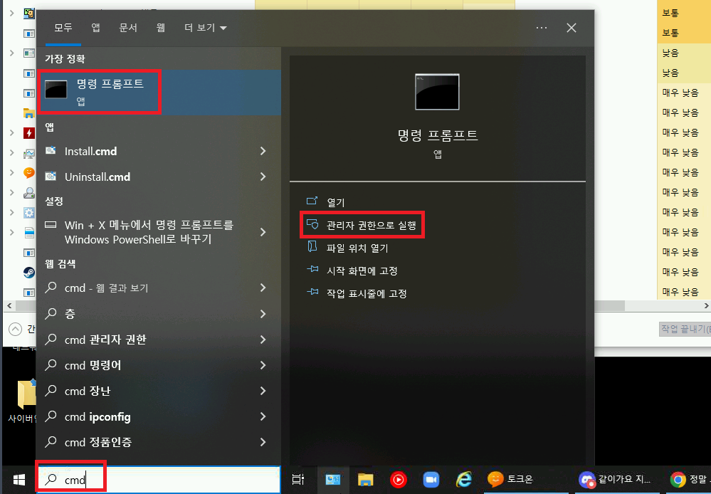 2. cmd를 검색하면 명령 프롬프트라는 앱이 나오는데 해당 앱을 관리자 권한으로 실행해 줍시다.